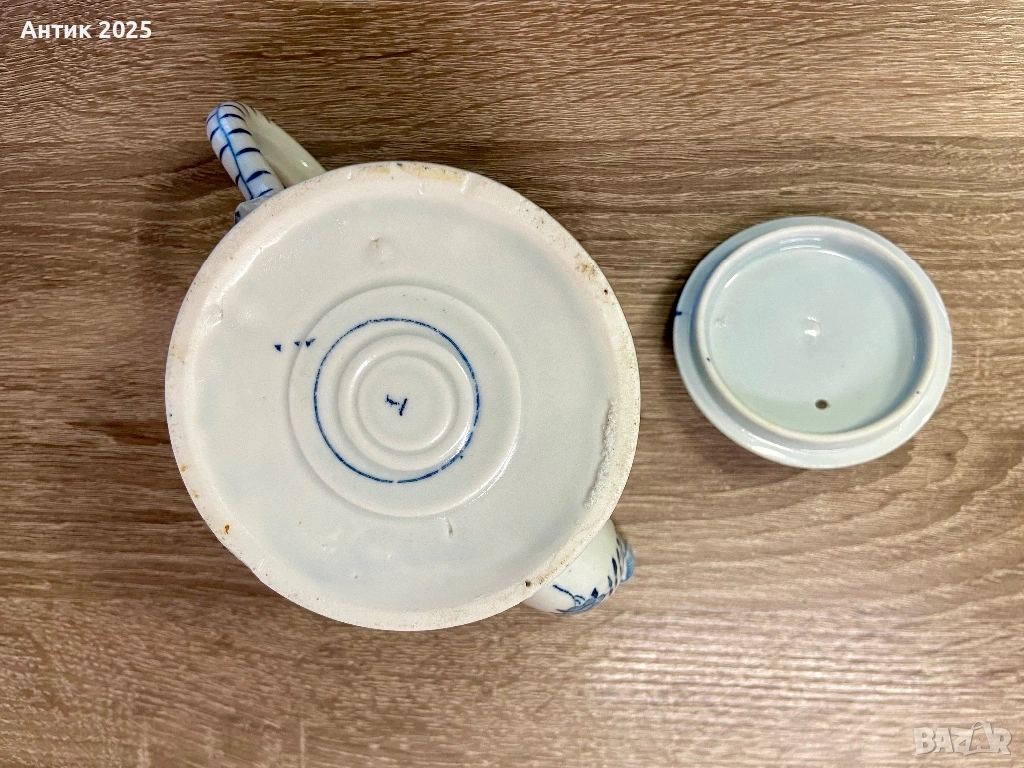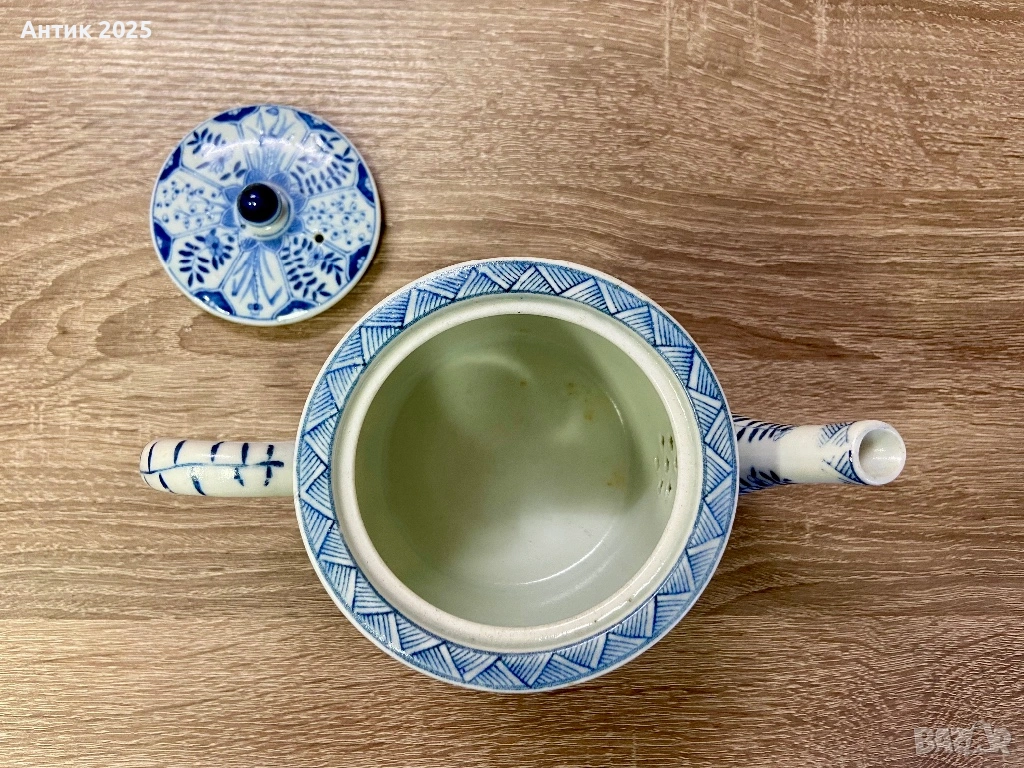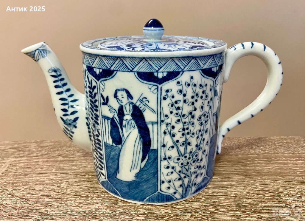 Античен чайник от холандски порцелан, произведен от манифактурата Mosa в Маастрихт (Нидерландия) около 1900 година. Изделието е украсено със синьо-бял декор в стил chinoiserie, изпълнен чрез трансферна печатна техника с характерния мотив „Long Eliza“, изобразяващ ориенталски фигури и декоративни растителни елементи.