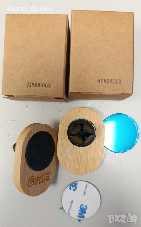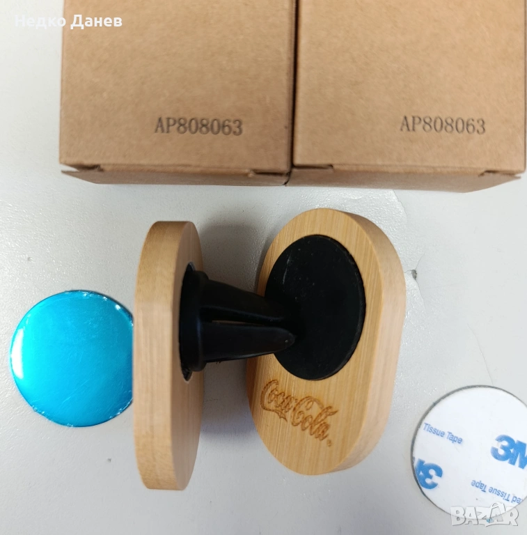 - Магнитна поставка за телефон за автомобил. Дървена основа с надпис Coca Cola с вграден магнит. Щипки за захващане към решетката на климатика и метална пластинка за телефон. Цена. 7 евро за брой. + Подърък цилиндрична метална кутия.