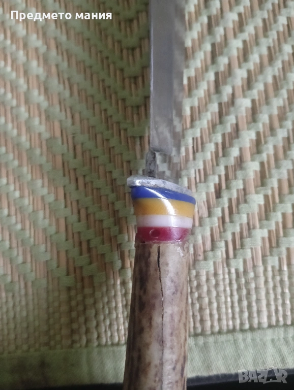 Ножът е запазен, със следи от времето, които му придават автентичен вид. Острието е здраво, без големи наранявания. Има лека пукнатина по рога на дръжката (видима на снимките), която не пречи на здравината, но е съобразена с цената.