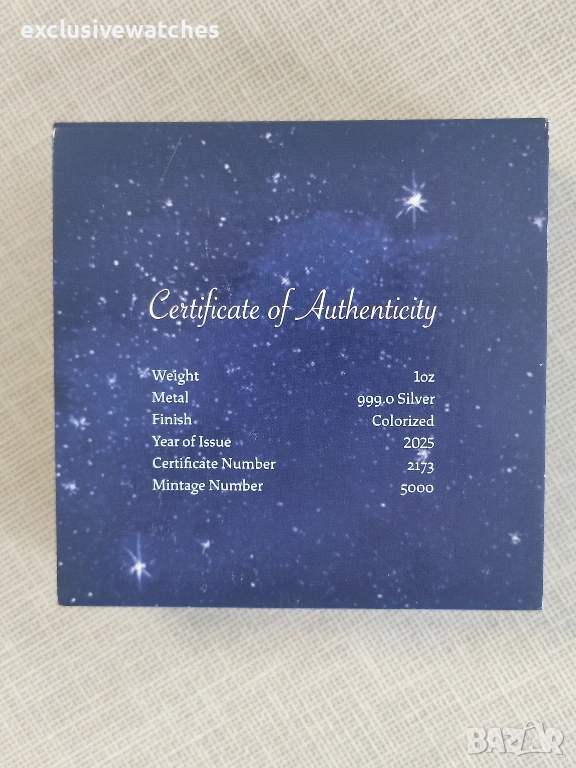 Това изделие е отсечено от една унция чисто сребро проба .999 с качество proof, с размери 29 x 50 мм. Цветният лицев край и детайлното покритие подчертават майсторството. Лимитирана серия от 5000 броя, тя е представена в кутия с магнитно затваряне и празничен външен калъф. Кюлчето е закрепено в капсула в дунапренена тава и защитна кутия.