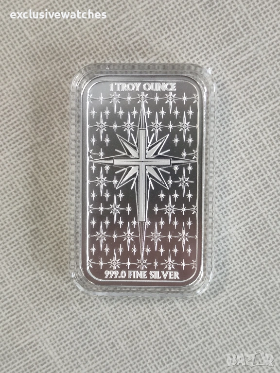 Гръб: стилизиран християнски кръст върху декоративен фон. В горната част е надписът „1 TROY OUNCE“; в долната част - чистотата на среброто.