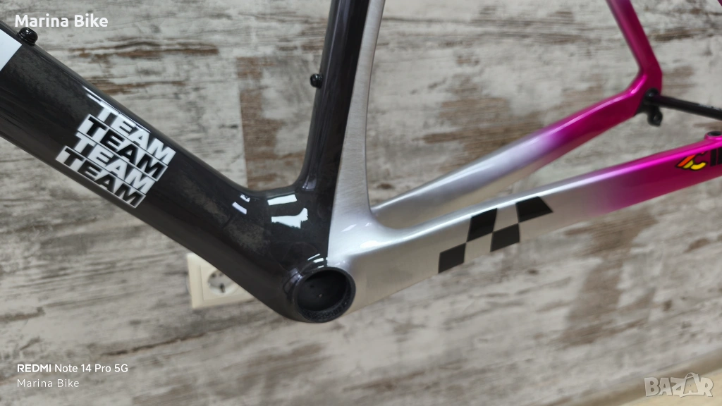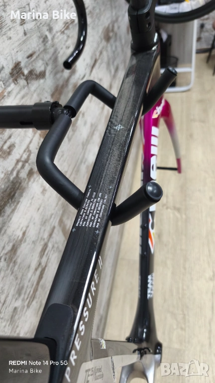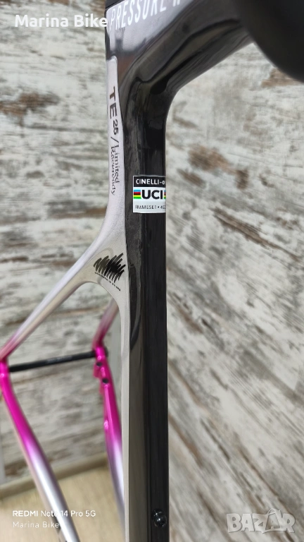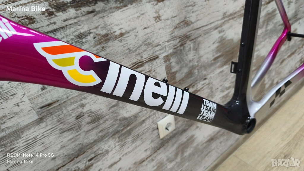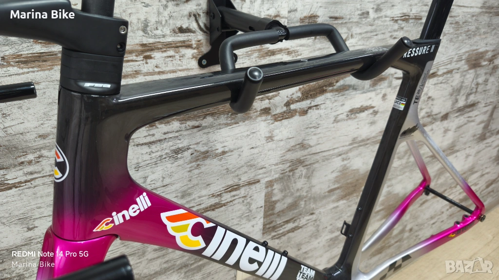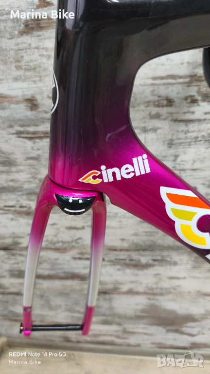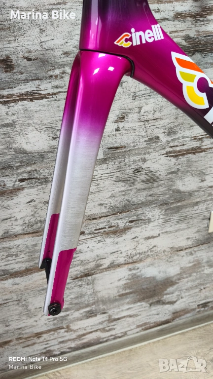 Чисто нова оригинална карбонова шосейна рамка от най-висок клас Cinelli Pressure II Team Colpack Disc, модел 2025 година, размер L. Рамката не е сглобявана и е без следи от съхранение, като стержена на вилката и седалковото колче са цели, не са рязани.