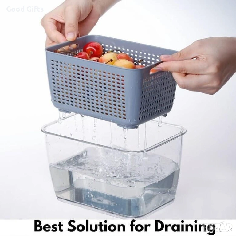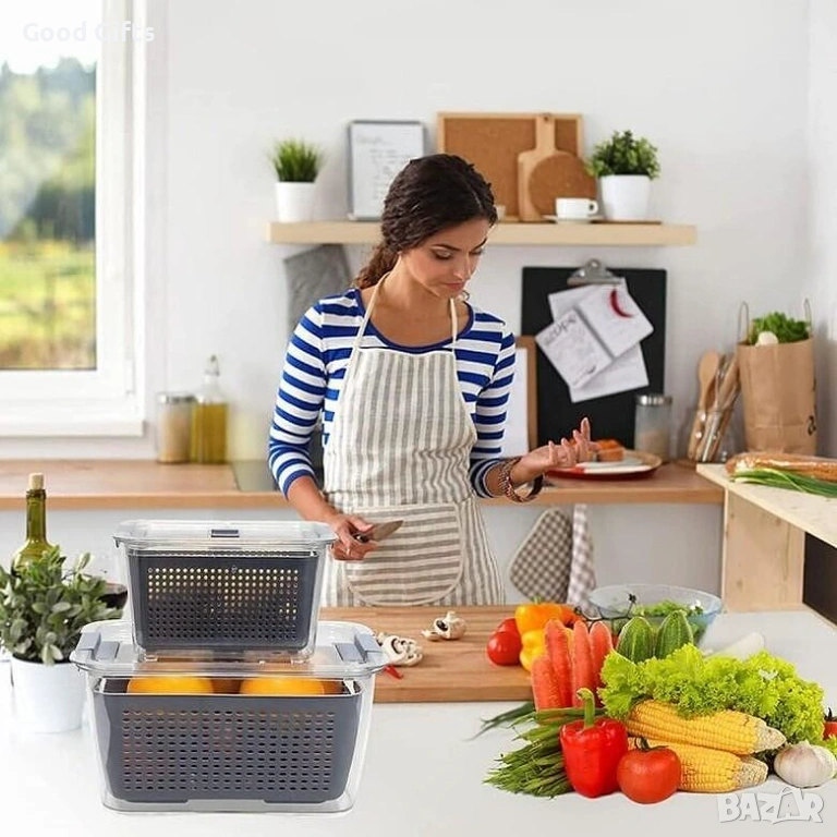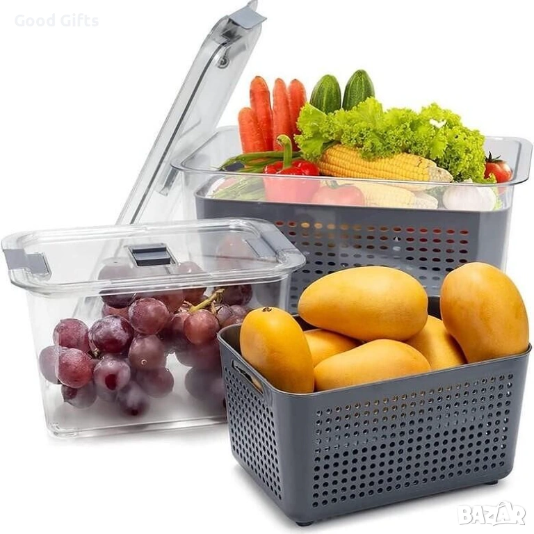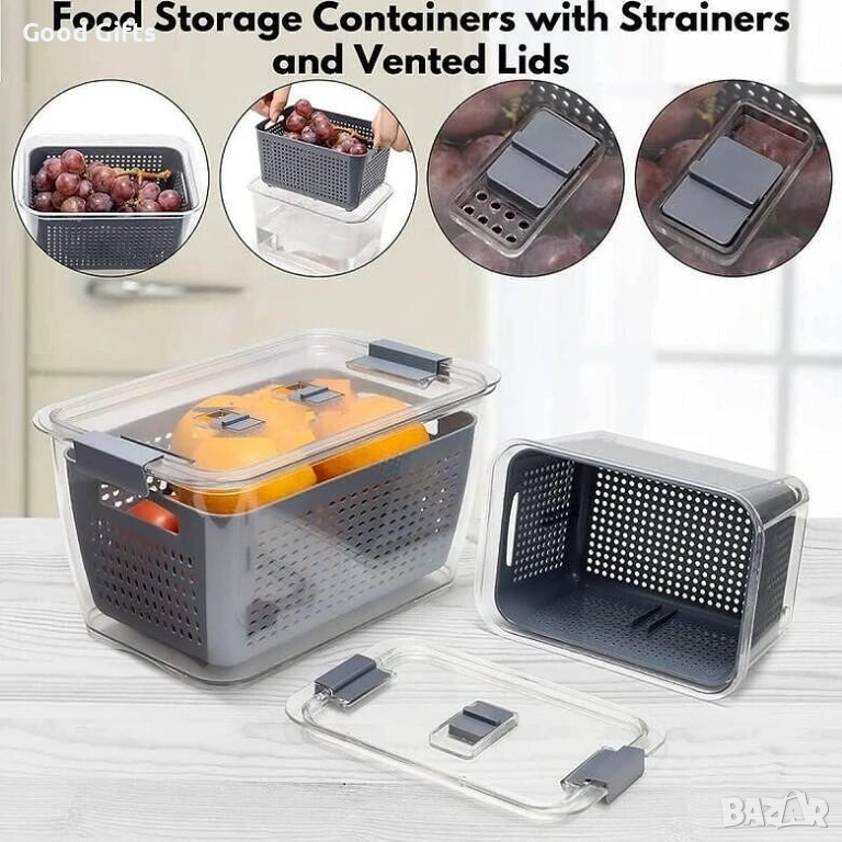 Изработени от висококачествена, безопасна пластмаса (BPA-free), тези съдове са идеалното решение за съхранение на всичко – от крехки горски плодове до пресни салати. Уникалната вградена кошница за отцеждане позволява на излишната влага да се отдели от продуктите, предотвратявайки тяхното гниене и поддържайки ги хрупкави и свежи за много по-дълго време.