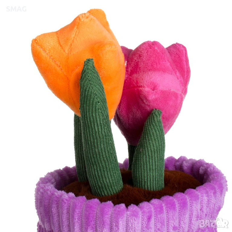 Декоративна плюшена саксия в лилав цвят с текстилни лалета в жълто и цикламeно – нежен и романтичен акцент за Свети Валентин. Подходяща е за украса на дом, офис или витрина, като внася свежест и уют. Отличен избор за оригинален подарък без нужда от поддръжка. Запазва красивия си вид през цялата година.