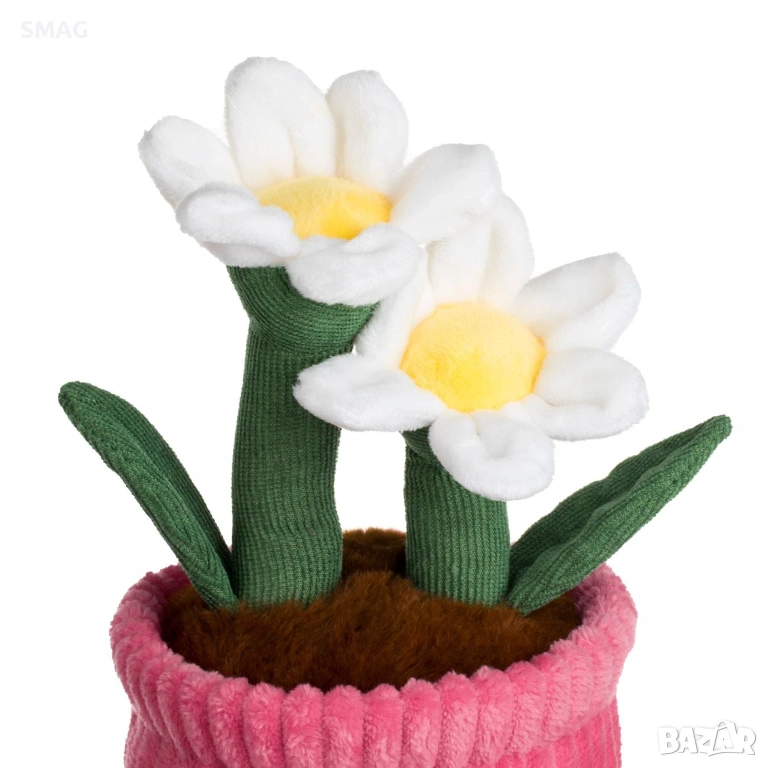 Декоративна плюшена саксия в цикламeн цвят с бели маргаритки – нежен и романтичен акцент за Свети Валентин. Подходяща е за украса на дом, офис или подарък с емоционално послание. Внася свежест и уют без нужда от поддръжка. Отличен избор за дълготрайна декорация.