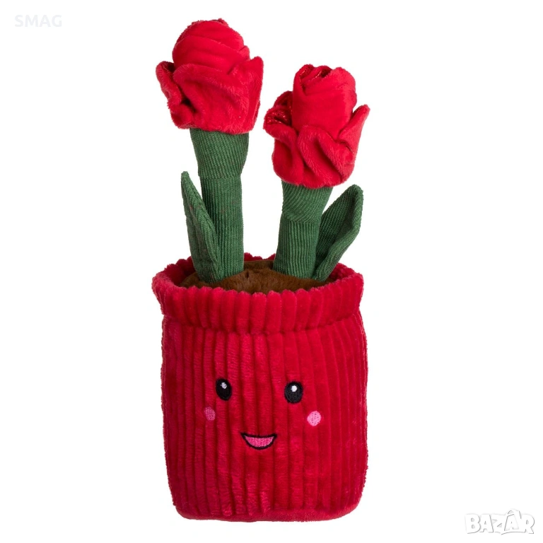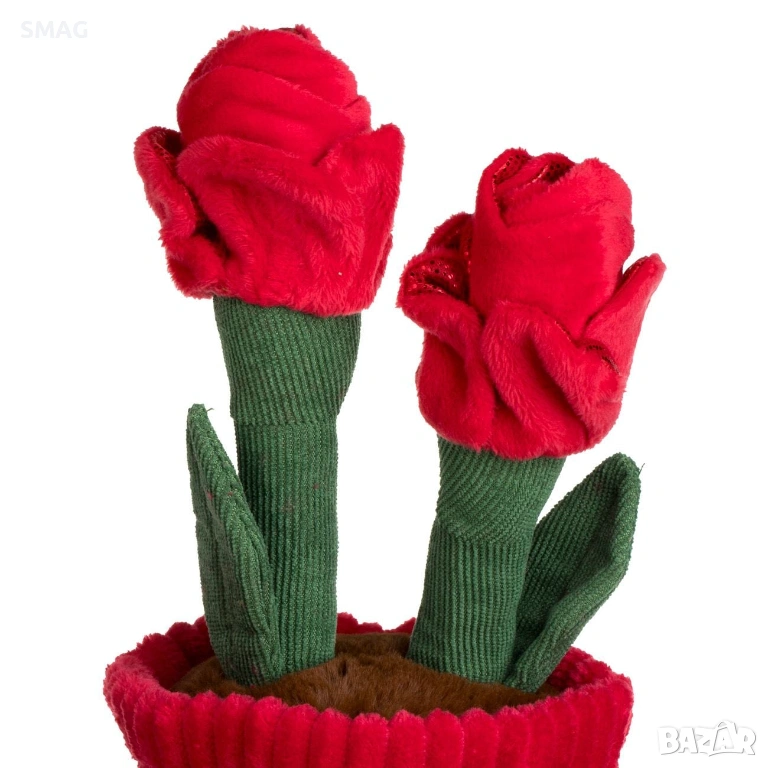 Декоративна плюшена саксия в червен цвят с текстилни рози и фолио детайли по листенцата – израз на любов и внимание за Свети Валентин. Създава романтична атмосфера в дома, офиса или спалнята. Подходяща е като елегантен и дълготраен подарък за любим човек. Не изисква поддръжка и запазва перфектния си външен вид.