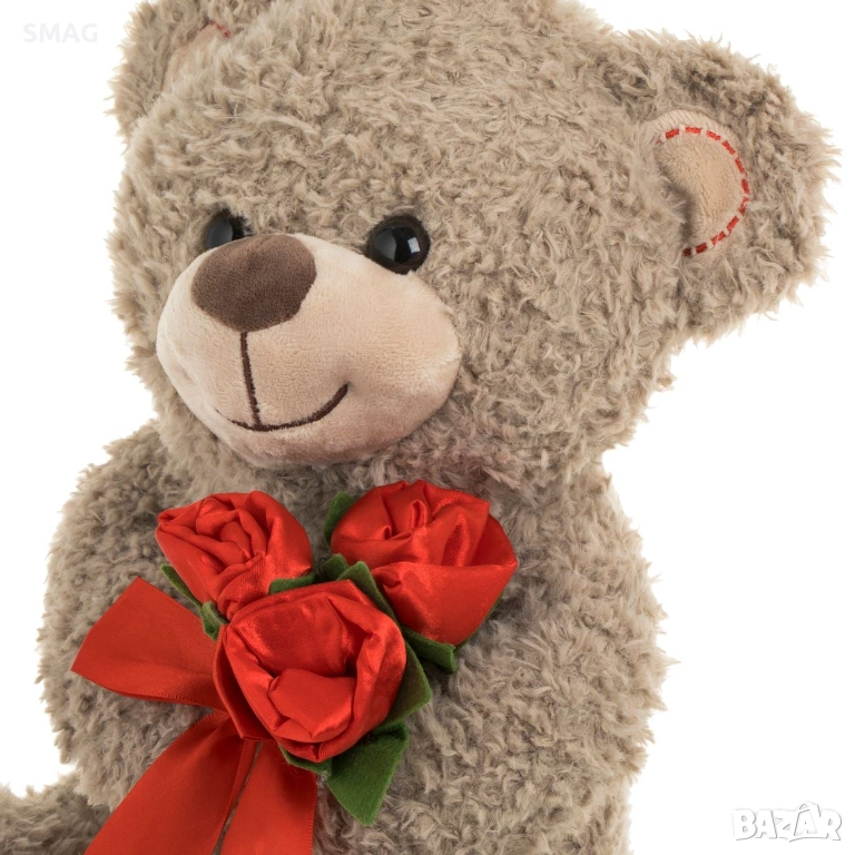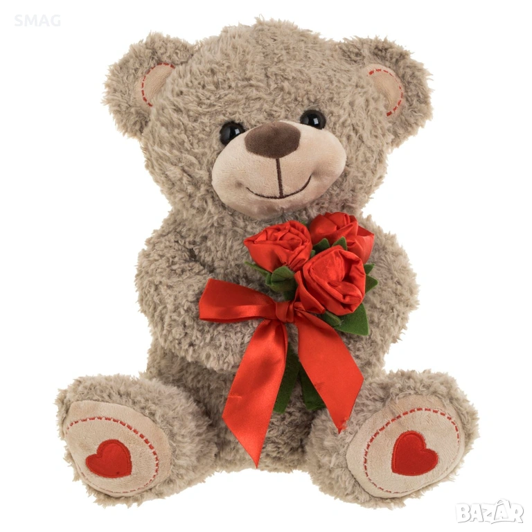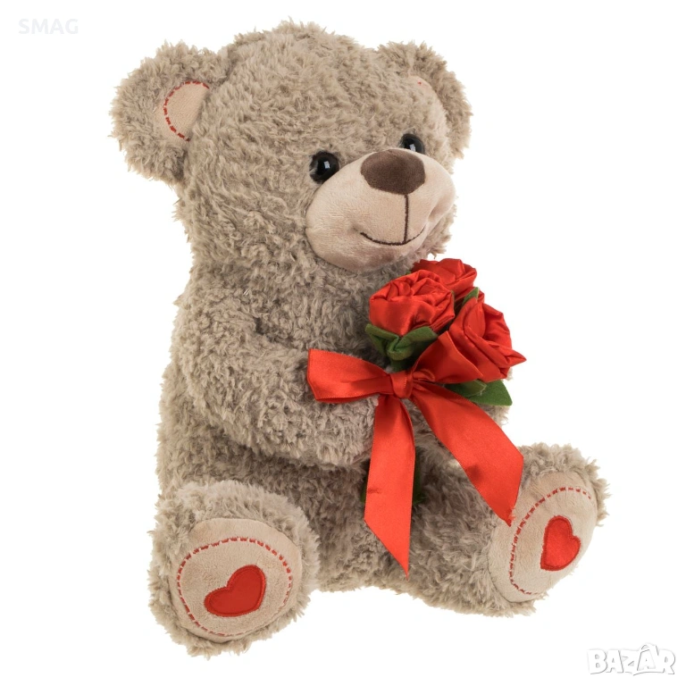 Меко кафяво плюшено мече, държащо букет от червени текстилни рози и с декоративни сърца по лапичките – идеален подарък за Свети Валентин. Изразява обич и внимание по сладък и запомнящ се начин. Подходящо е за декорация или като романтичен жест за любим човек.
