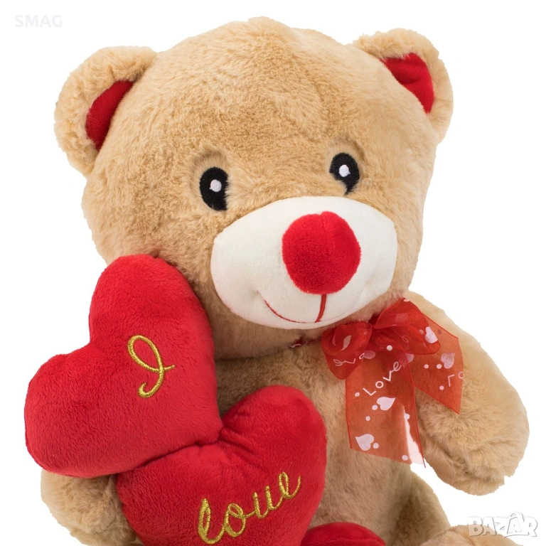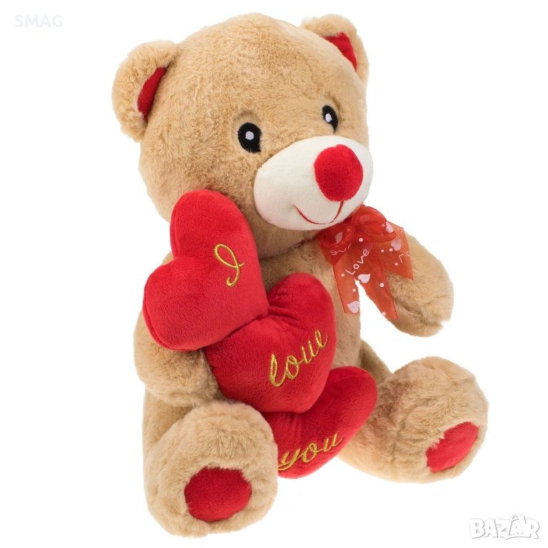 Меко бежово плюшено мече, държащо тройно червено сърце с бродирано послание „I Love You“ – идеален подарък за Свети Валентин. Изразява обич и романтика по красив и впечатляващ начин. Подходящо е както за декорация, така и за запомнящ се жест към любим човек.