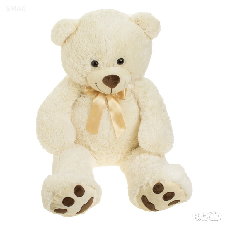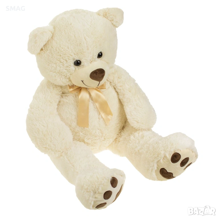 Мека плюшена мечка в екрю цвят с панделка и големи лапи – впечатляващ подарък за Свети Валентин. В седнало положение е 70 см, а височината 100 см я прави забележителен подарък за любим човек. Идеална за прегръдки и декорация, носеща уют и радост.