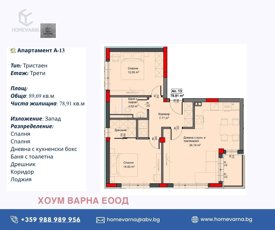ДИРЕКТНО ОТ ИНВЕСТИТОР! Строителна фирма Хоум Варна ЕООД продава апартаменти и паркоместа в жилищна сграда в кв. Аспарухово, ул. Борис Киряков 4. На шест жилищни етажа са разположени 16 двустайни, 16 тристайни и 1 четиристаен апартаменти. На разположение на живущите ще бъдат 17 подземни и 19 дворни паркоместа. Отличен достъп, улично осветление и страхотна панорама към морето и града. Стартирало строителство. Етапи на завършване: Акт 14: март 2026 г., Акт 15: ноември 2026 г., въвеждане в експлоатация март 2027 г. БЕЗ ТАКСА ПОДДРЪЖКА. Апартаментът А-13 се състои от 2 спални, дневна с кухненски бокс и трапезария, баня с тоалетна, килер, коридор и лоджия. Имотът е с обща площ 89,69 кв.м, което включва 78,91 кв.м чиста жилищна площ и 10,78 кв.м общи части.Посочената цена e при схема на плащане 50/40/0/10. За повече информация: https://homevarna.bg/imoti/apartament-a-13-3/