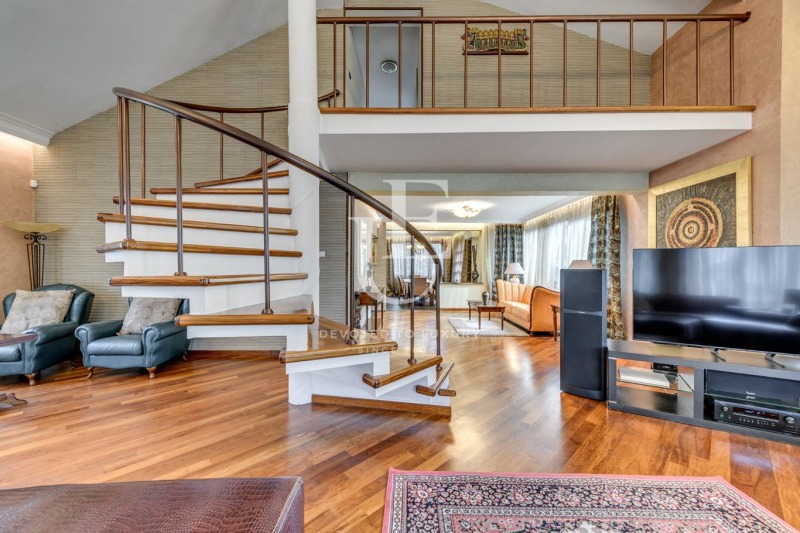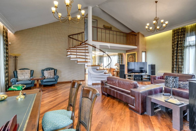 Имотът съчетава класически луксозен интериор с неокласически детайли, създаващи усещане за простор, представителност и уют. Обзавеждането е подбрано с внимание към детайла, с масивна мебелировка и елегантни акценти, които придават на жилището характер и непреходна естетика. Централен архитектурен акцент е елегантното вито стълбище, което осъществява връзката между двете нива и допринася за визуалната динамика и усещането за обем в пространството, като на места височината на таваните достига близо 5 метра.