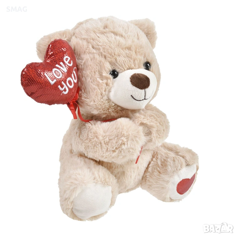 Меко бежово плюшено мече с червено сърце на лапичката и червен фолио балон във форма на сърце с бяла бродерия „Love You“ – чудесен подарък за Свети Валентин. Симпатично и романтично, създава уютна и весела атмосфера. Подходящо е за подарък или декоративен акцент за любим човек.