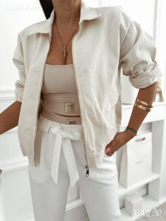 Дамско късо преходно яке тип бомбър, цип по цялата дължина и свободна кройка.