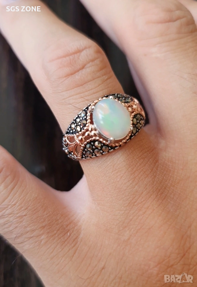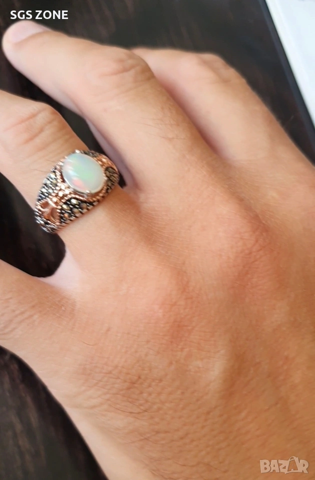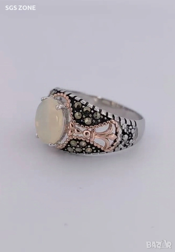 Мъжки сребърен пръстен с бял опал и марказит → Обява 53370220