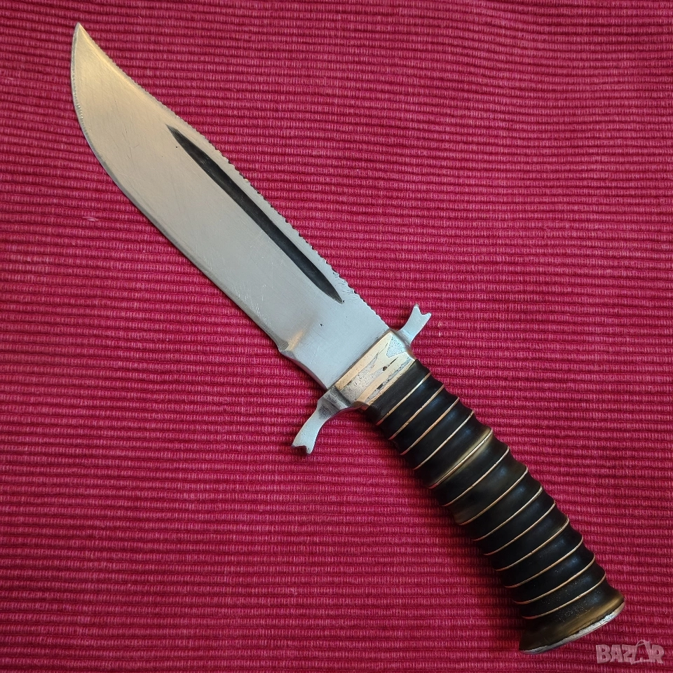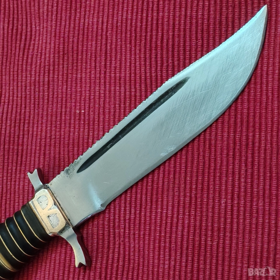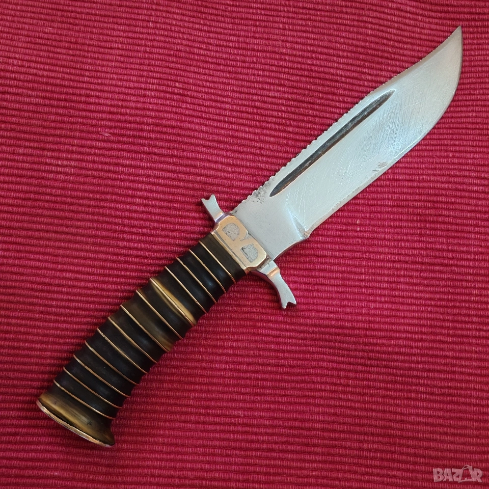 ловен нож, касапски, цяло острие, въглеродна стомана. Дръжка от месинг и епоксидна смола с двустранен гард и вградени инициали от месинг в самия гард, М В. Размери острие 15/3.4/0.4 см, дръжка 10.5 см, тегло 230 грама, много здрав и балансиран. Острието е за заточване и полиране. Еконт, Спиди, лично предаване. Телефон за връзка 0885776829.