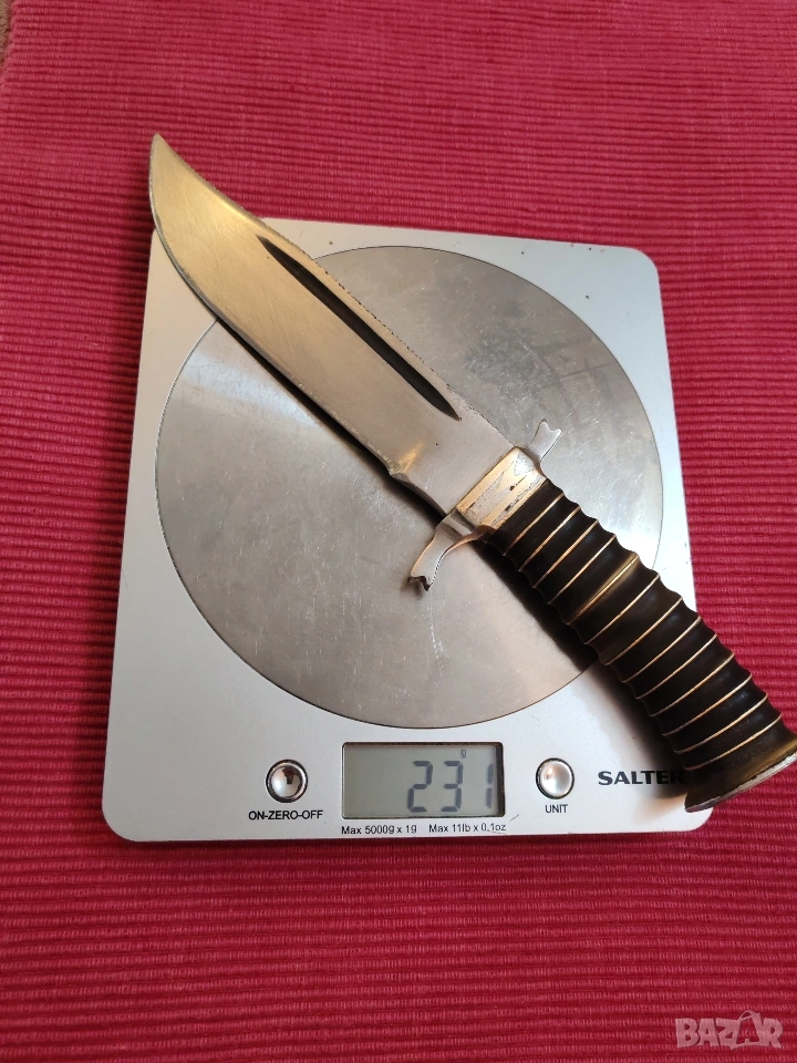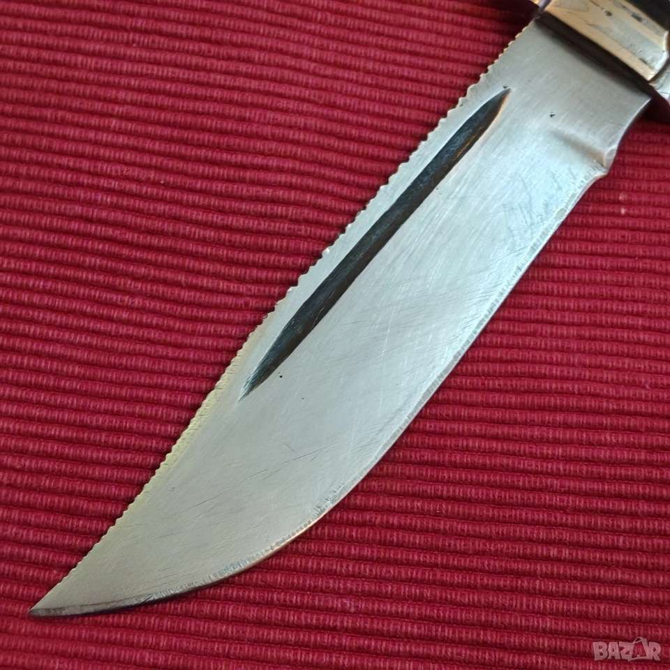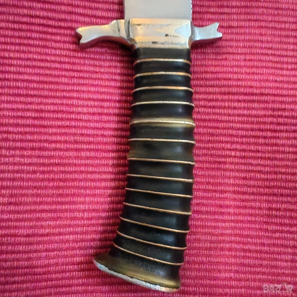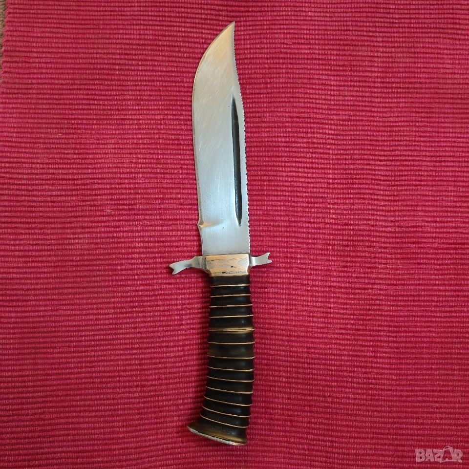 ловен нож, касапски, цяло острие, въглеродна стомана. Дръжка от месинг и епоксидна смола с двустранен гард и вградени инициали от месинг в самия гард, М В. Размери острие 15/3.4/0.4 см, дръжка 10.5 см, тегло 230 грама, много здрав и балансиран. Острието е за заточване и полиране. Еконт, Спиди, лично предаване. Телефон за връзка 0885776829.