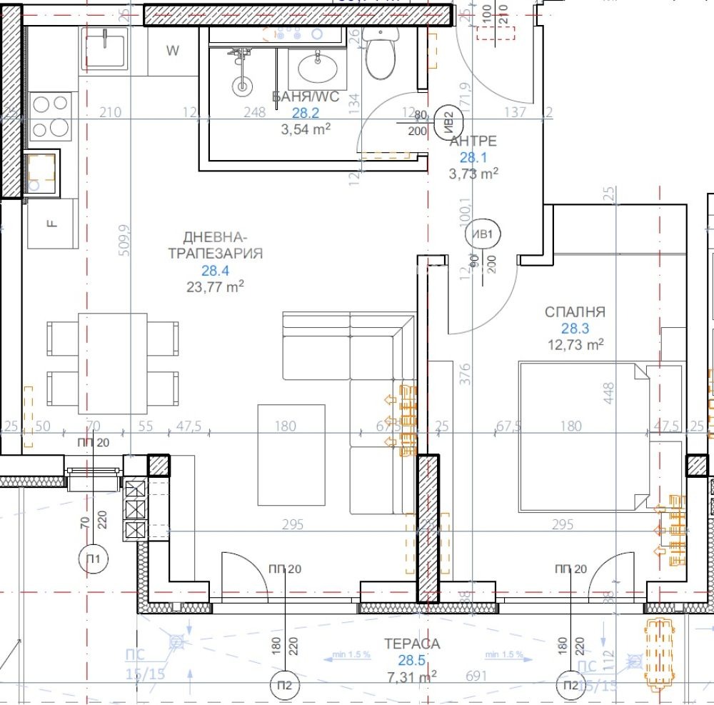 Двустаен апартаметн завършен до клиюч с подови настилки и готова баня. Състои се от дневна с кухненски бокс, спалня, баня с тоалетна и тераса.