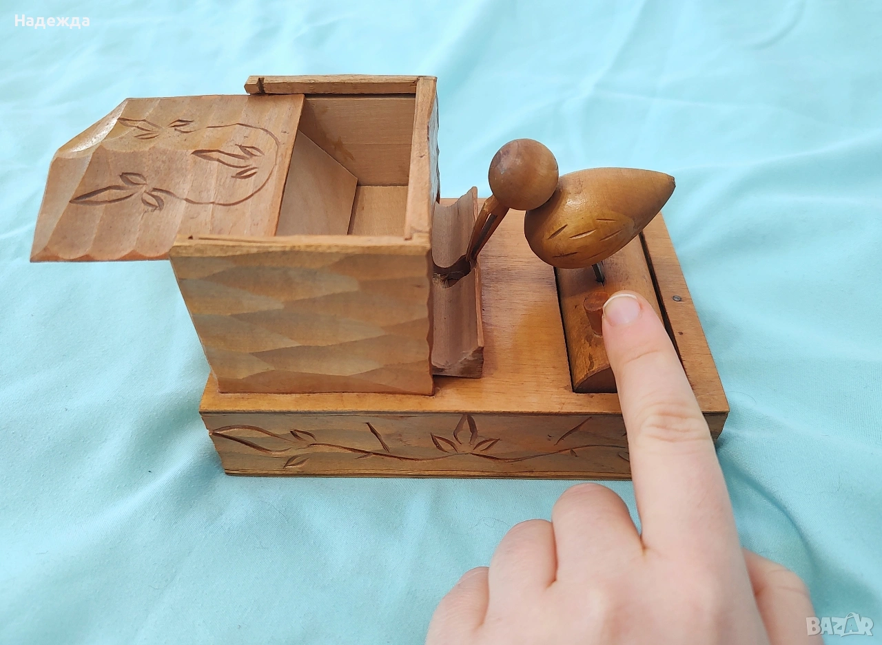 Декоративна дървена табакера с резбовани орнаменти и движещ се елемент. Отделението за цигари се пълни и чрез механизъм пилето се накланя да 'вземе' спуснатата пред него цигара. Табакерата е подходяща за ретро подарък или за декорация в дома.