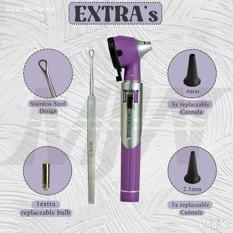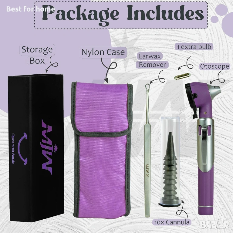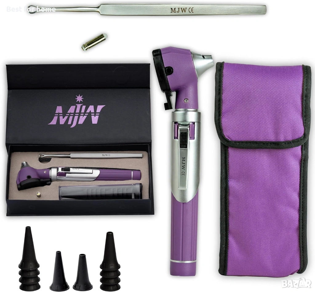 Една торбичка съдържа: един мини-отоскоп в лилав цвят. Бутон за включване/изключване с натискане с един палец и Инструмент за отстраняване на ушна кал. 10 ушни спекула. Всички те са опаковани в лилава торбичка. LED: Отоскопът на MJW съдържа LED светлина за ясно и гладко виждане при изследване на ухото. Предлагаме сменяема LED светлина. Можете лесно да смените LED светлината, ако някоя се повреди.
