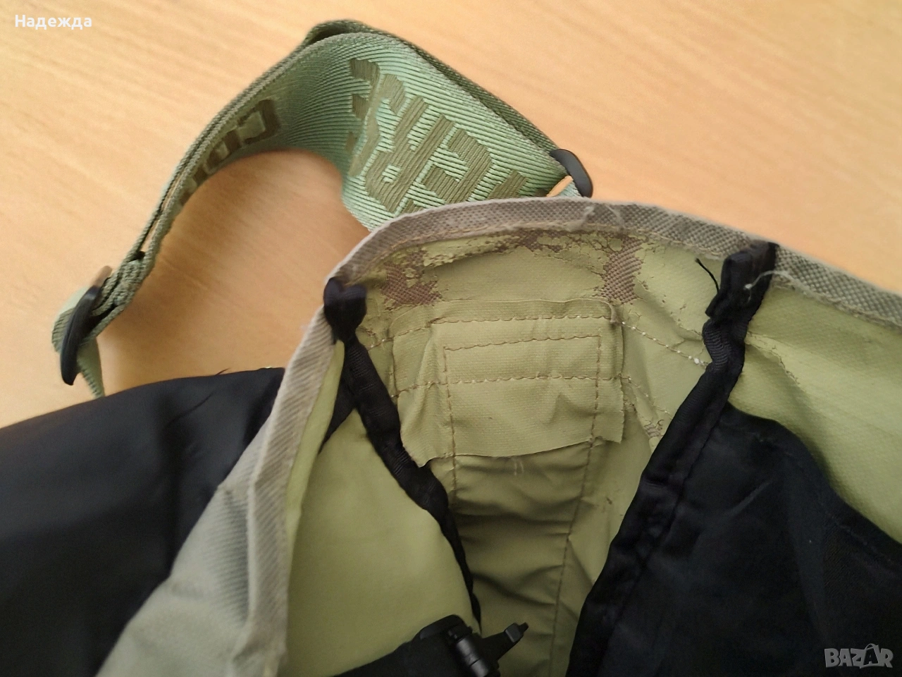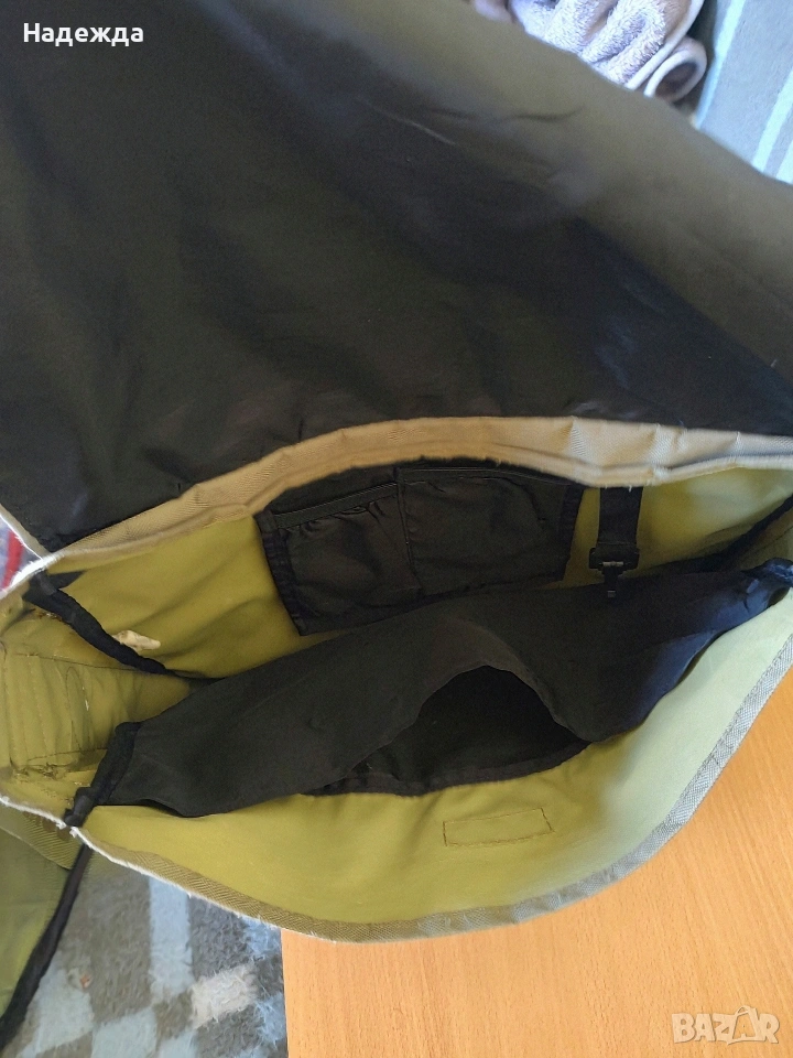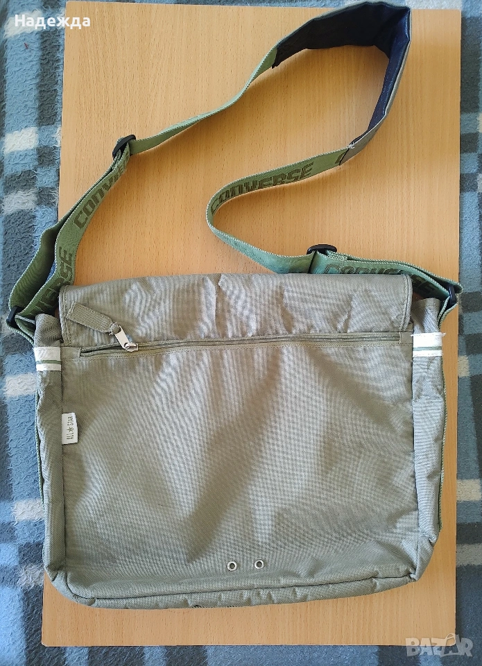 Чанта с регулируема презрамка за през рамо на марката Converse в маслинено зелен цвят. Един джоб на гърба, два големи вътрешни джоба, две малки джобчета и държач за ключове.