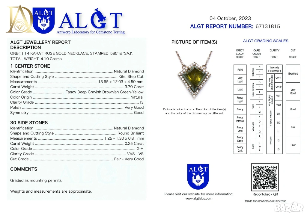 - ALGT сертификат на бижуто и цялостен лабораторен анализ за естествения произход на диамантите направен в България.