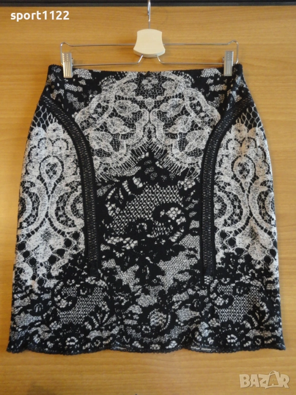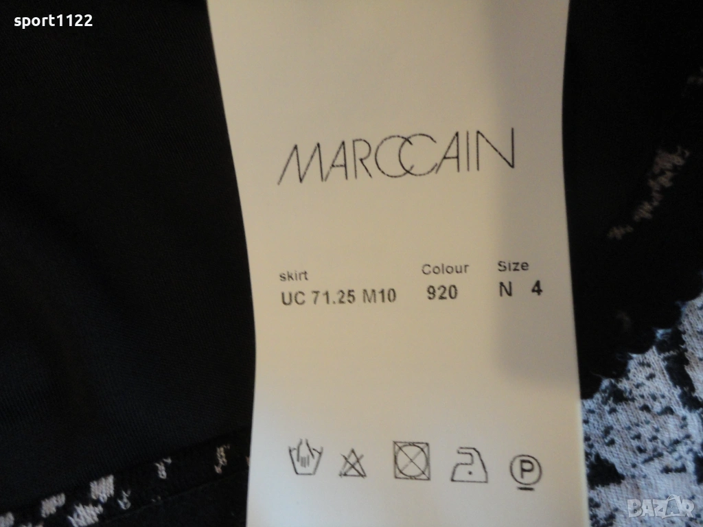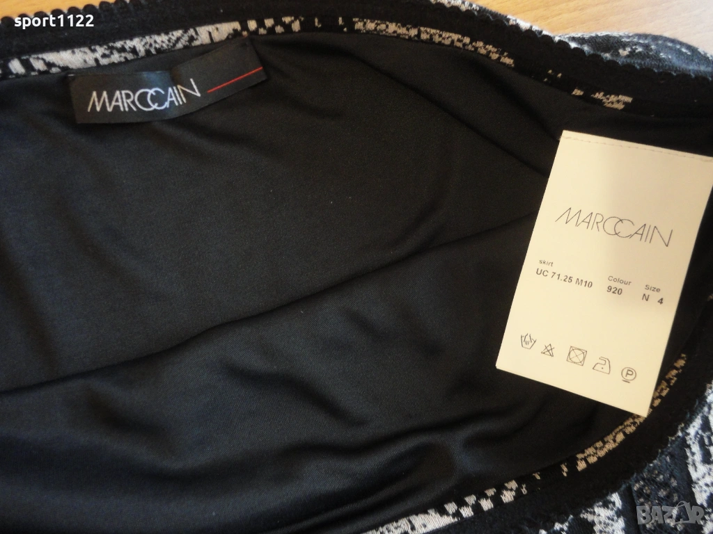 Пола на Marccain, от фино плътно трико, състав 50% вълна, 41% памук, 9% найлон, има разтегливост. Не е ползвана, но е без хартиения етикет. Десенът е имитация на дантела. Дължината е до коляното, но зависи и от ръста.