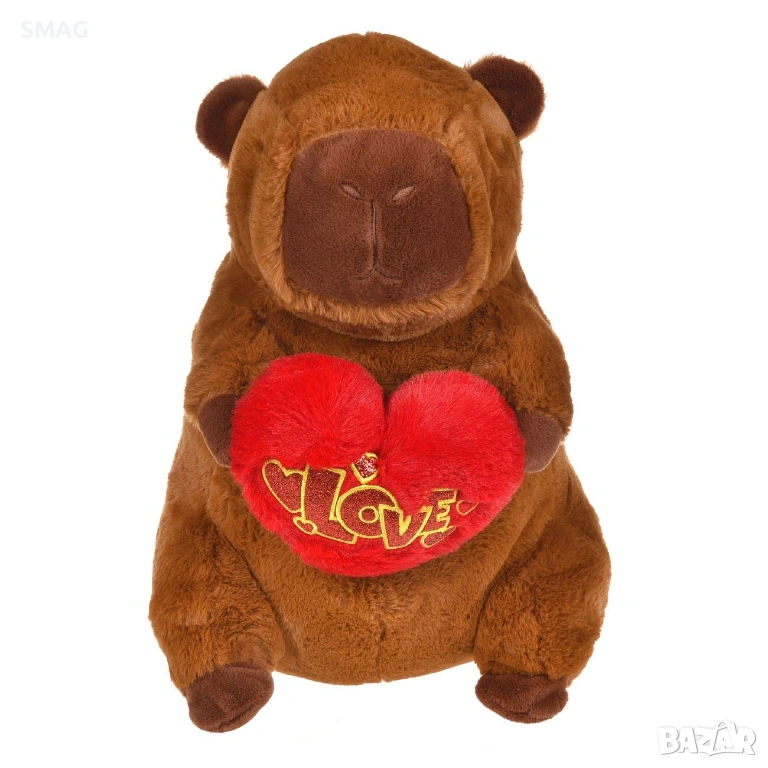 Мека плюшена капибара с червено сърце в прегръдките си – сладък подарък за Свети Валентин или специален човек. Симпатична и приятна на допир, носи радост и уют. Идеална за прегръдки или като декоративен акцент в стаята.
