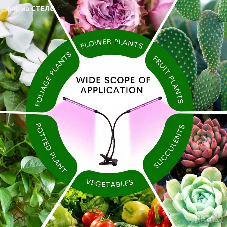 Пълен спектър: Устройството работи като специализирана фитолампа с 3 режима (Червен, Син и Смесен), покриващи нуждите на културите от поникване до цъфтеж.
