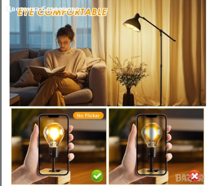 Комфортна светлина.Просто активирайте, няма светкавица. Осигурява комфортна светлина за очите ви. Забележка: Крушките E14 не могат да се регулират по яркост.