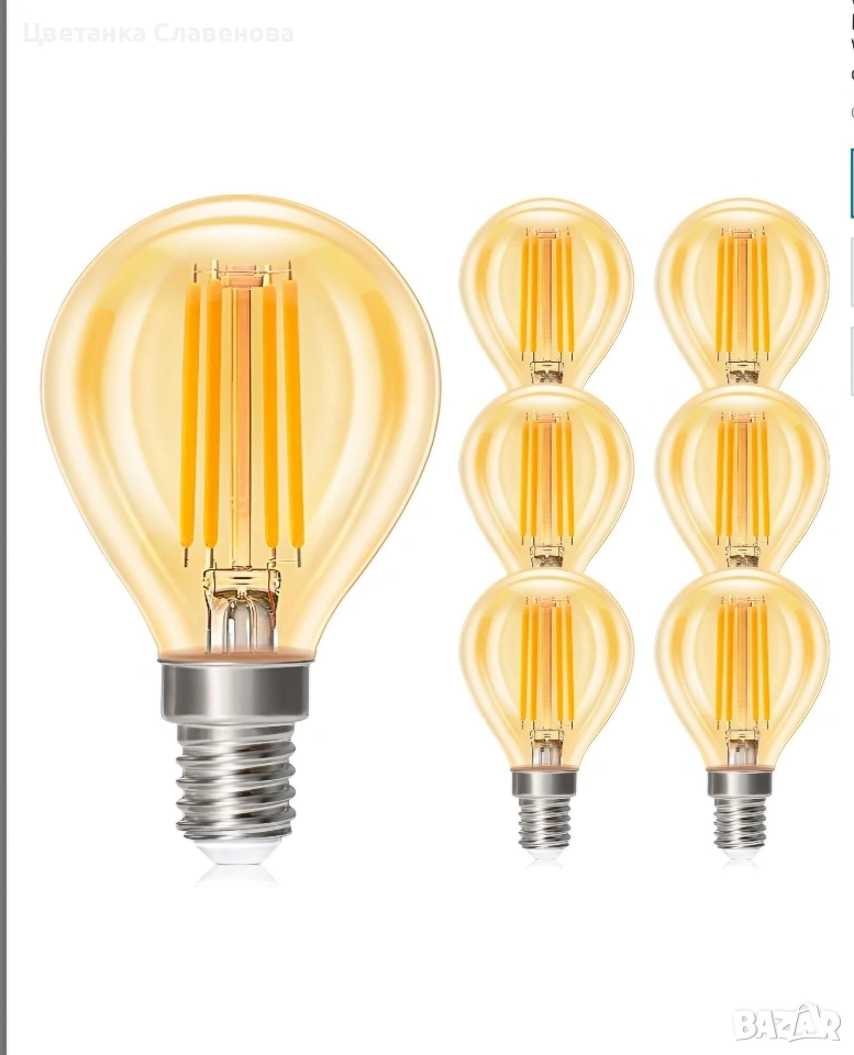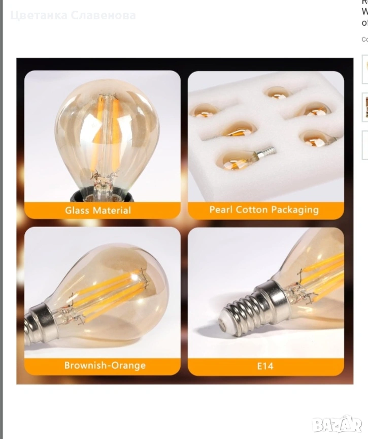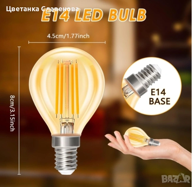 E14 Топло бяла LED лампа Топла бяла светлина (кехлибарено сияние) за благополучие и релаксация в живота, съня и детските стаи. LED крушка с нажежаема жичка излъчва кехлибарена светлина 2700k, използва се с лампа E14, подходяща за хол, спалня, кухня, коридор и др. За създаване на топла атмосфера.
