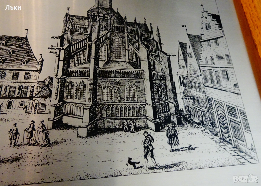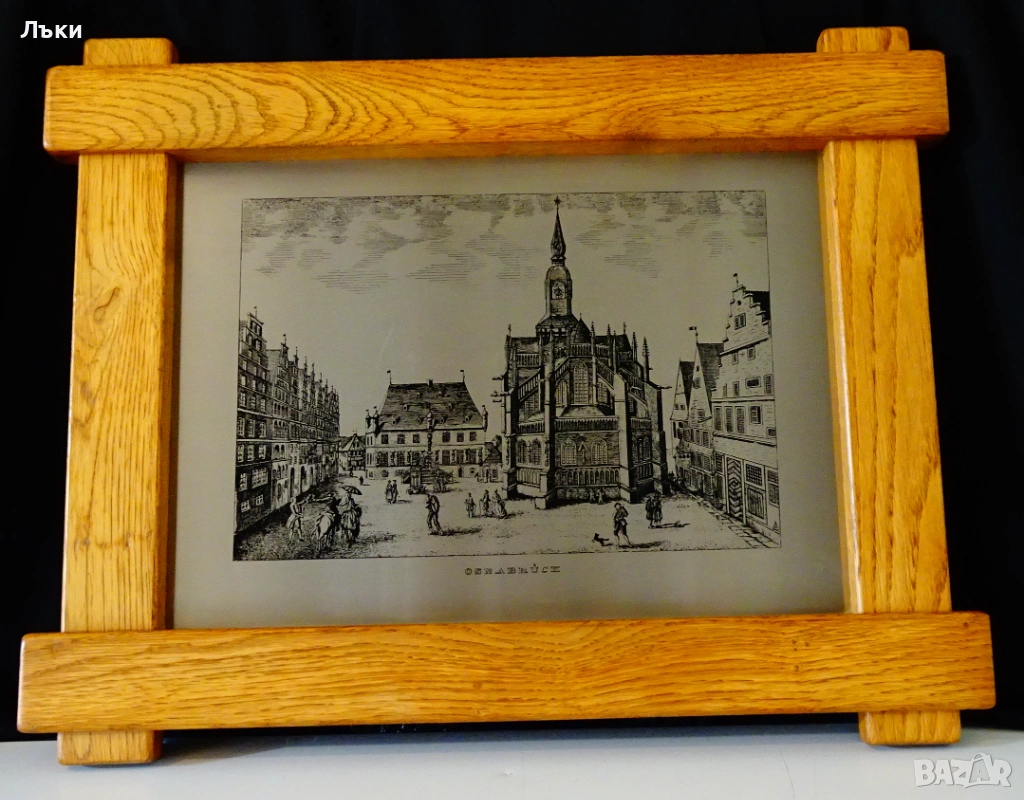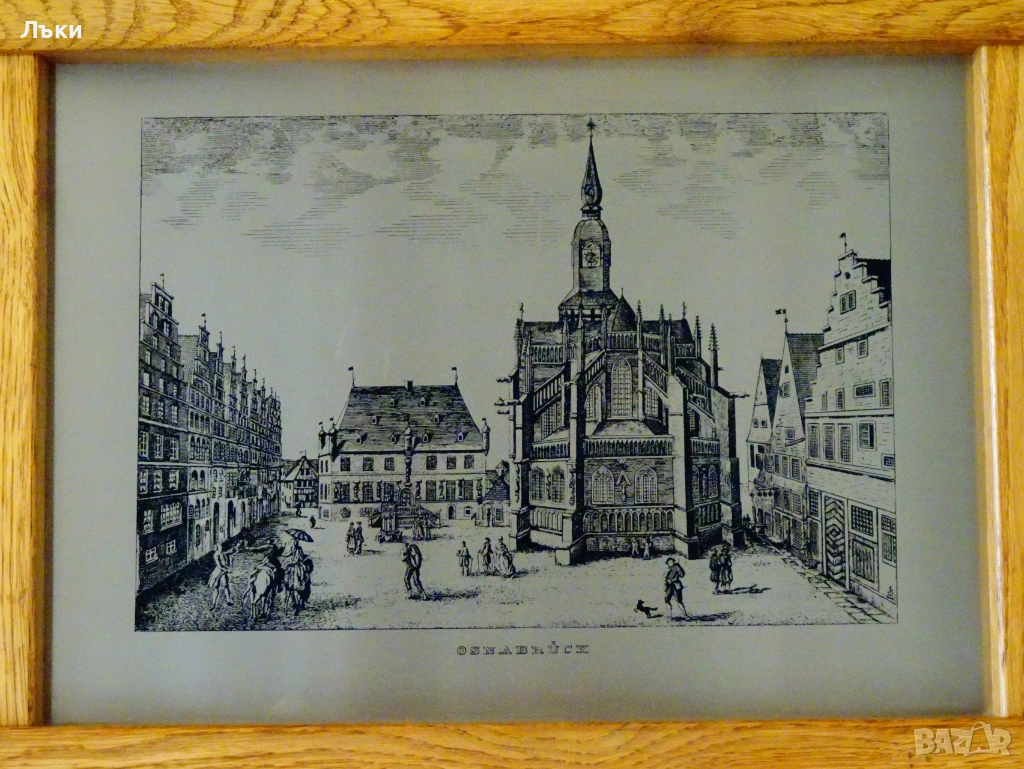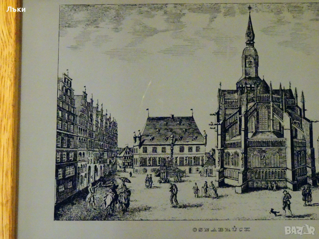 гравирано изображение от град Оснабрюк с ембематични сгради в готически стил,върху