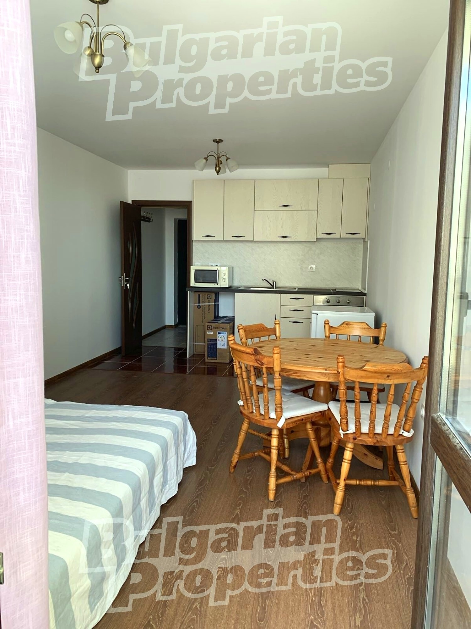 функционален кухненски кът, оборудван с електроуреди