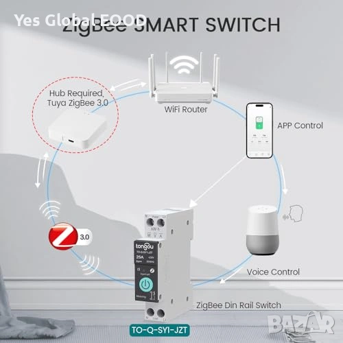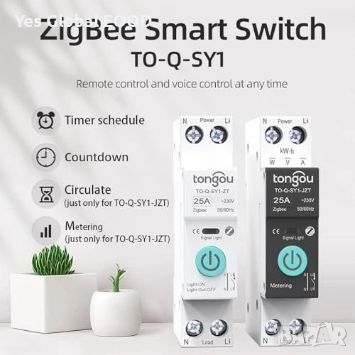 TONGOU DIY ZigBee интелигентният превключвател е смарт реле с капацитет до 25A, предназначено за интеграция в смарт дом системи. Поддържа дистанционно управление чрез приложенията TUYA / Smart Life за iOS и Android, както и гласов контрол чрез Alexa и Google Assistant (изисква ZigBee хъб). Вградената функция за измерване позволява наблюдение на консумацията на електроенергия в реално време, а таймерите и графиците улесняват автоматизацията на електроуреди и осветление.