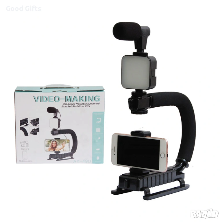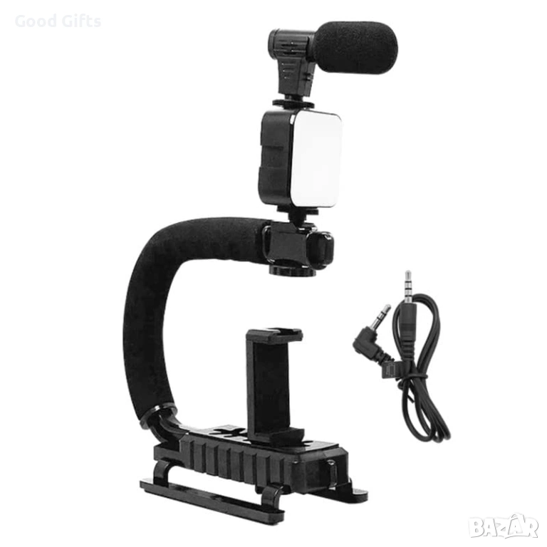 Ергономична C-образна дръжка: Покрита с мека неплъзгаща се пяна за комфорт при дълги записи. Позволява монтиране на телефони, фотоапарати и екшън камери.