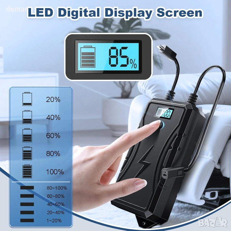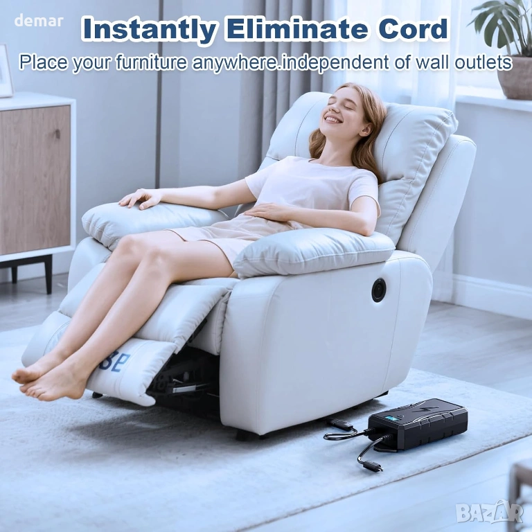 Безжичната акумулаторна батерия за електрически кресла позволява гъвкаво поставяне навсякъде в стаята, без да е необходимо да се свързва с контакт, което помага за поддържане на чистотата и безопасността на пространствата. Тя предлага дълготрайна употреба с едно зареждане, с удобно презареждане чрез стандартен електрически контакт, когато е необходимо. Вграденият LED индикатор ясно показва оставащото ниво на батерията с един поглед, така че знаете кога е време за презареждане. Проектиран с 2-пинова връзка, той е широко съвместим с повечето електрически кресла, дивани, повдигащи се столове и двуместни дивани и се предлага в комплект със зарядно устройство, удължителен кабел и захранващ кабел за лесна настройка и употреба.