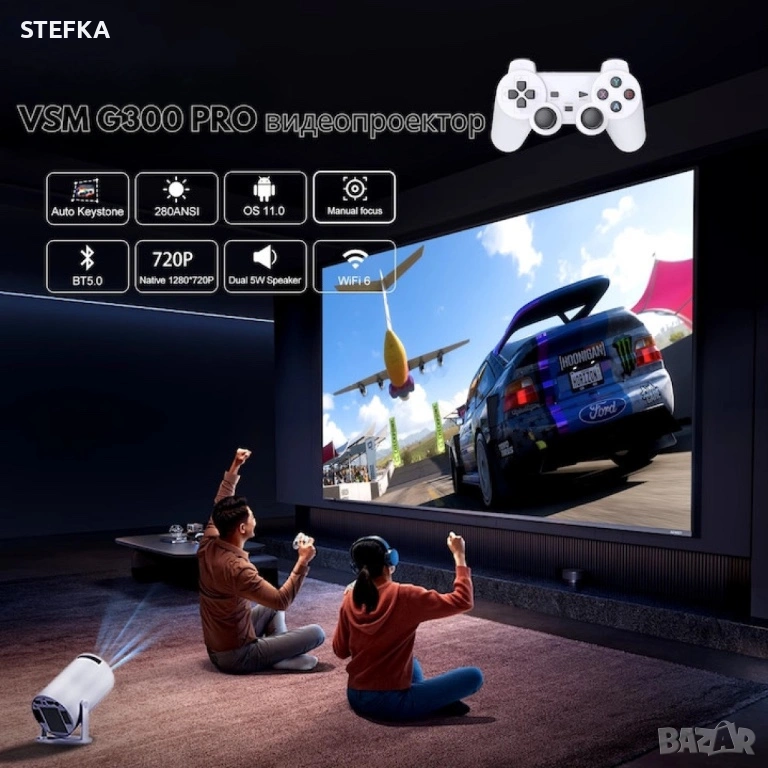 Интелигентен видео проектор 4K с два геймпада, дистанционно управление, Android TV 11 и WiFi 6