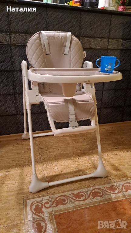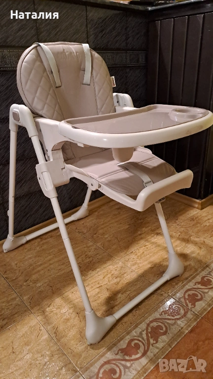 Лесно се сгъва. Лек, с регулируема височина на седалката, таблата на масичката се сваля за лесно почистване. Сваляща и вдигаща се подставка за крачетата на детето.