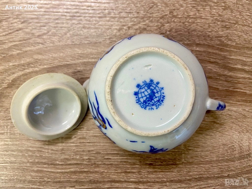 Декоративен чайник от японски порцелан, произведен за експортния пазар в средата на XX век. На дъното е налично клеймо Made in Japan, характерно за следвоенното експортно производство.