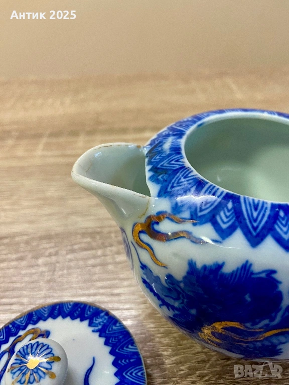 Чайникът е украсен с изразителен синьо-бял декор с изображение на дракон — традиционен символ на сила, мъдрост и защита в източната култура. Декорацията е допълнена със златни акценти, които подчертават динамиката на орнамента и придават декоративна изразителност на изделието.
