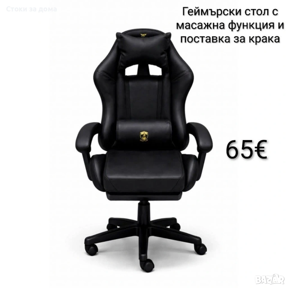 Геймърски стол с масажна функция, поставка за крака, Черен