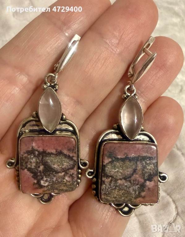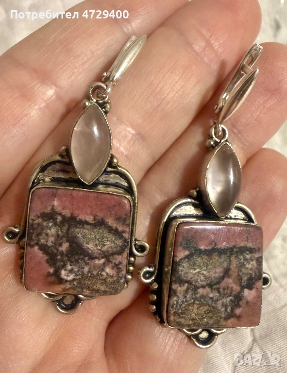 Сребърни обеци с естествени камъни радонът и розов кварц → Обява 53373657