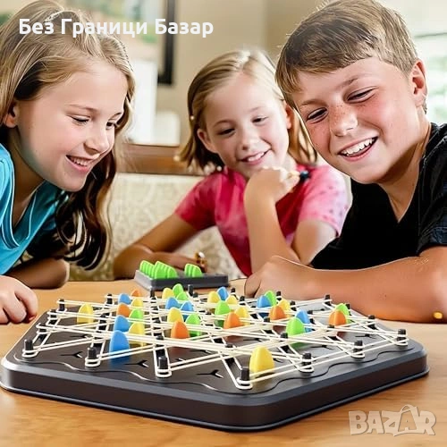Комплектът включва здрава дъска, 84 цветни елемента и ластични ленти за многократна игра