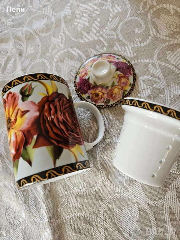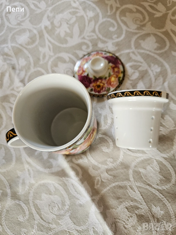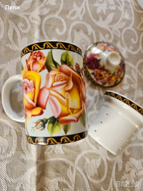 Предлагам красива, порцеланова чаша за чай с порцеланова, подвижна цедка и капаче за запарване на чая. Вместимост 250 мл.