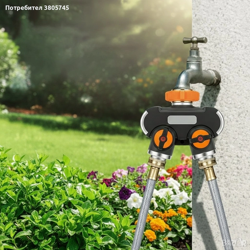 Двупосочен разпределител за градински кран 2-в-1: Сплитер за маркуч с независими вентили (3/4" и 1") → Обява 53374110