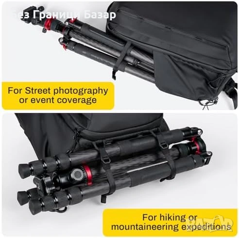 Интелигентна организация: 8 отделения – техника, статив, бутилка, батерии и дребни аксесоари подредени и бързо достъпни