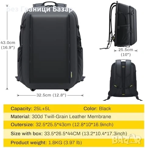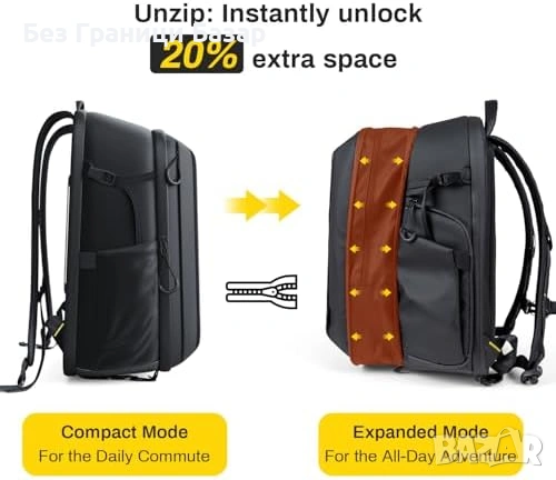 Голям капацитет: 25L + 5L разширяемо отделение – място и за дрехи при кратки trips