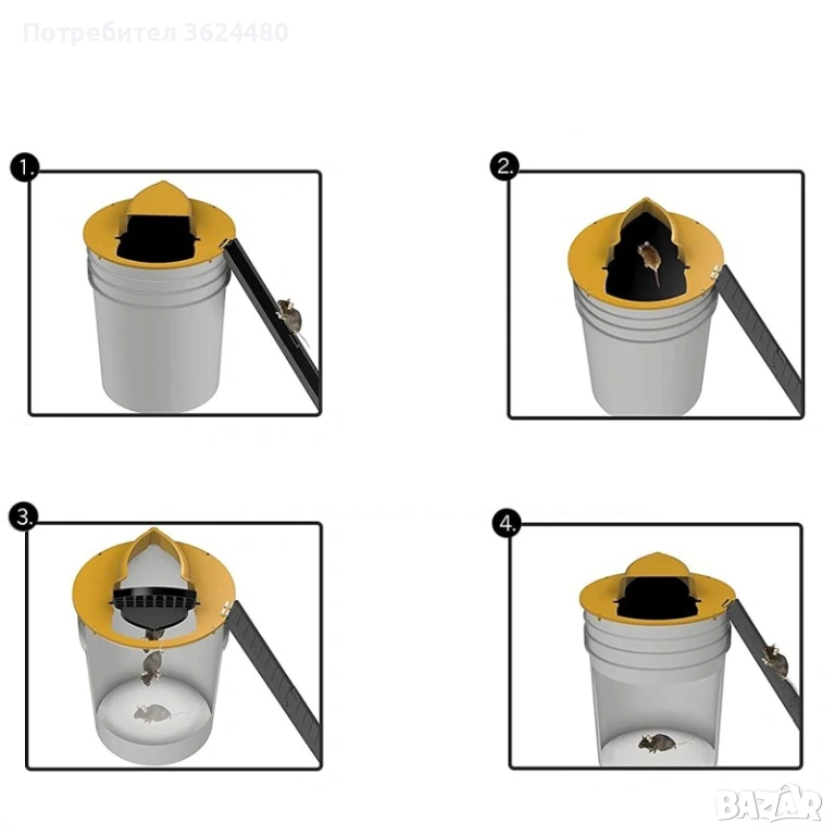 Как работи? Привлечена от примамката, мишката се изкачва по приложената рампа, стъпва върху подвижния капак и тежестта ѝ моментално го накланя, изпращайки я право в кофата. Механизмът веднага се връща в изходна позиция, готов за следващия неканен гост.