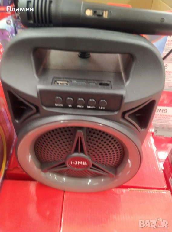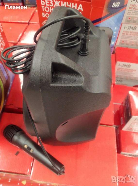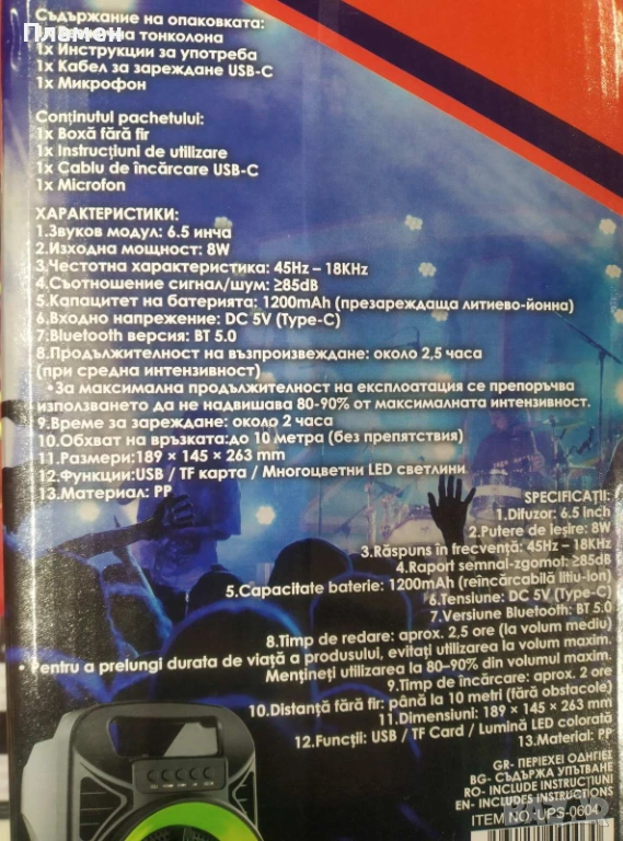 светлини, AUX вход, микрофон и функция FM/TF/BT/AUX. Има USB вход и може да се
