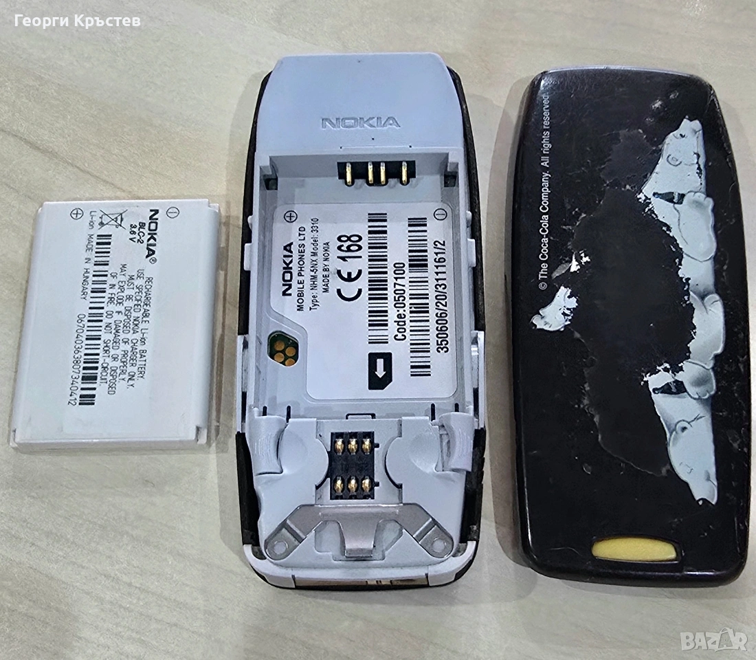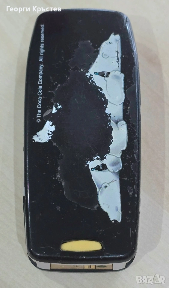 Телефона се включва и работи идеално, тестван с А1, нямам друга за проба, зарежда си батерията, която е горе - долу добра, клавиатура, подсветка, слушалка, микрофон, всичко е ОК, има БГ меню, добър външен вид, панел на Coca Cola, но капака отстрани е счупен, и доста обелен, държачите към панела, които държат металната пластинка, за задния капак са счупени, и капака пада, няма стъкло на предния панел, без зарядно.