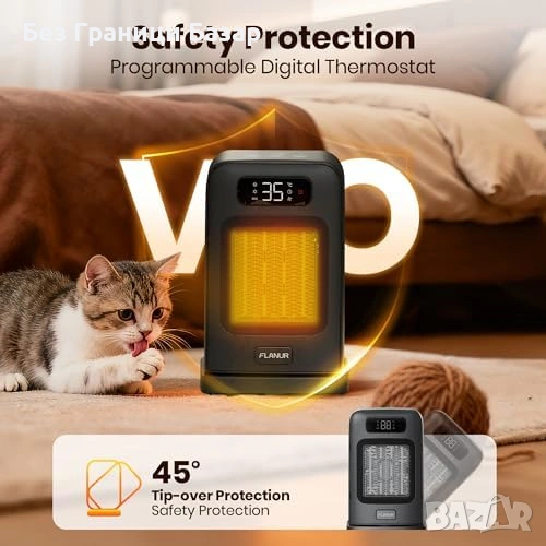 Защити: прегряване, автоматично изключване при накланяне, авто стоп след 24 часа, 30 сек. охлаждане след изключване